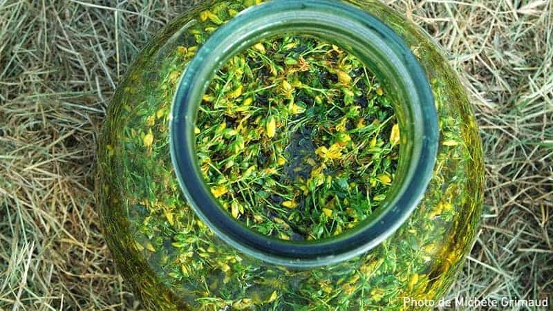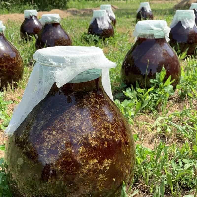 During summer time in June when it’s the peak harvest of St. John’s Wort oil, the St. John’s Wort flowers are infused in organic olive oils in large glass jars under the sun. The solar energy will draw all the healing properties from the flowers into the oil, the process last for 4-6 weeks. In the end, we get this red oil with high healing power!